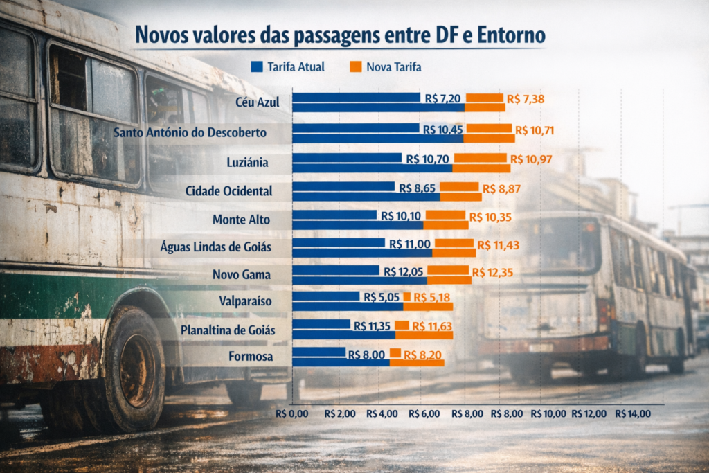 Reajuste de 2,546% autorizado pela Agência Nacional de Transportes Terrestres (ANTT) eleva tarifas entre DF e Entorno, enquanto usuários relatam ônibus antigos, atrasos e falta de conforto no transporte público