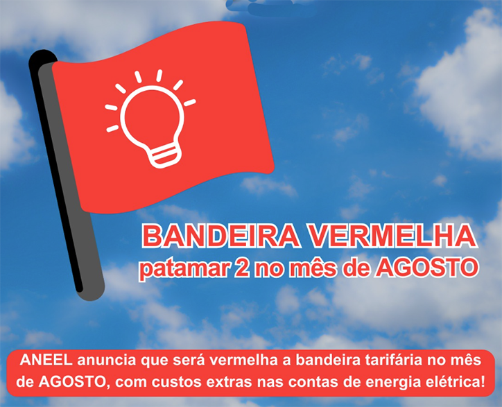 O mês de agosto terá um aumento nas contas de energia devido ao acionamento da bandeira tarifaria vermelha, no maior patamar, o 2, anunciou nesta sexta-feira (25) a Agência Nacional de Energia Elétrica (Aneel). Com isso, os consumidores terão custo extra de R$ 7,87 a cada 100 quilowatts-hora (kWh) consumidos.