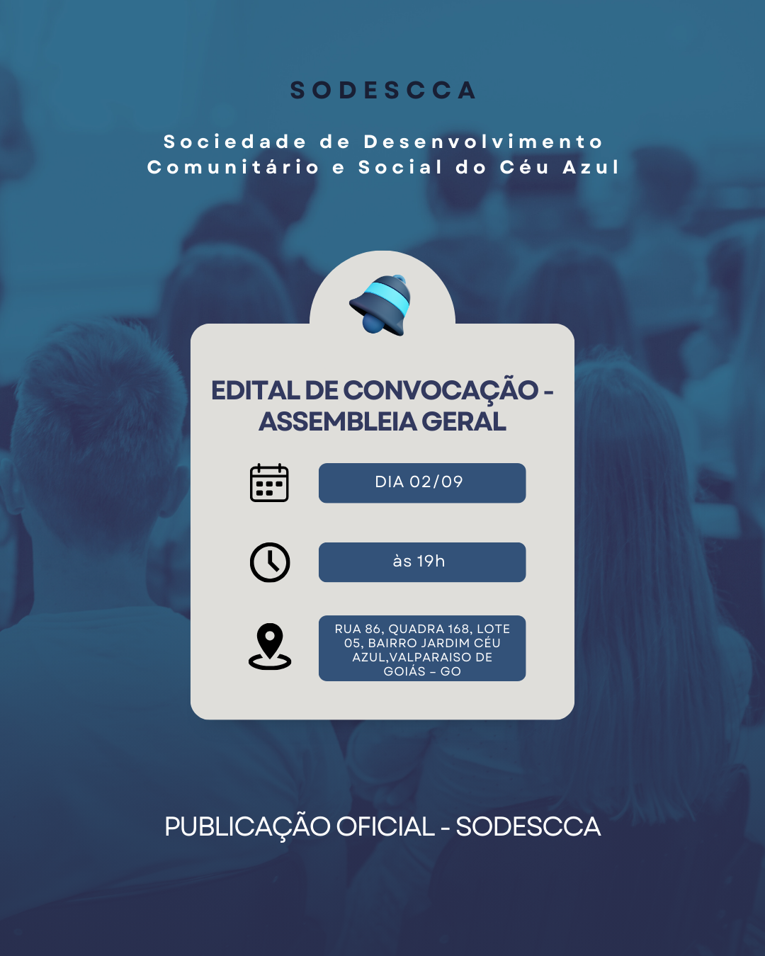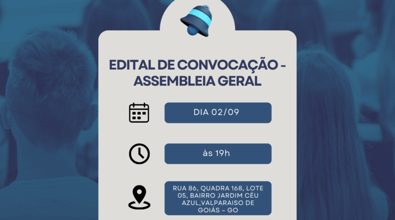 A Sociedade de Desenvolvimento Comunitário e Social do Céu Azul – SODESCCA, nos termos regimentais e estatutários, vem, por meio de seu presidente, Michell Tatico Chami, convocar todos os associados desta entidade, estando em dia com suas obrigações estatutárias, para a Assembleia Geral Extraordinária, a ser realizada no dia 02 de setembro de 2025, às 19h em primeira convocação e às 20h em segunda convocação, na sede da associação, localizada na Rua 86, Quadra 168, Lote 05, Bairro Jardim Céu Azul, Valparaíso de Goiás – GO.
