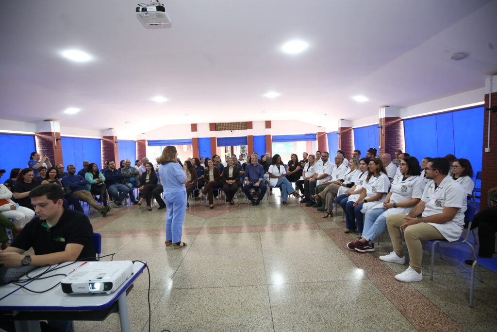 Após a solenidade, a secretária Fátima Gavioli participou de uma reunião com os servidores do CEPMG Fernando Pessoa e com gestores escolares beneficiados com as ordens de serviço.