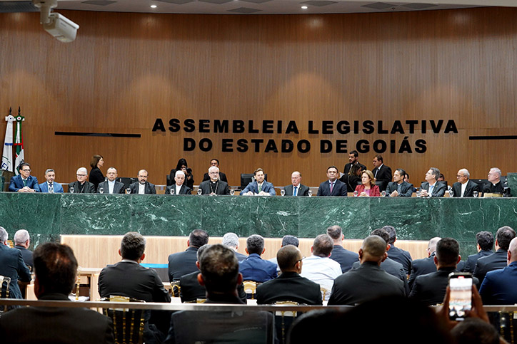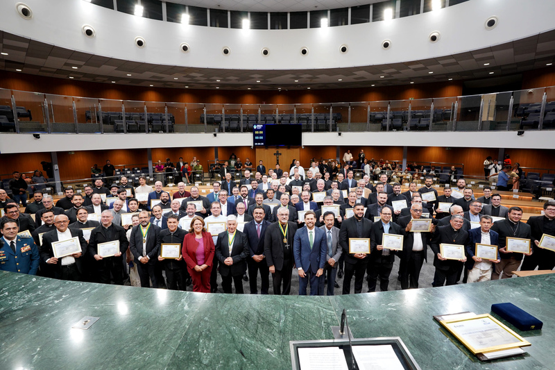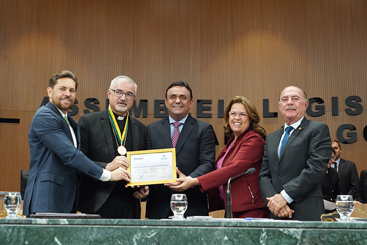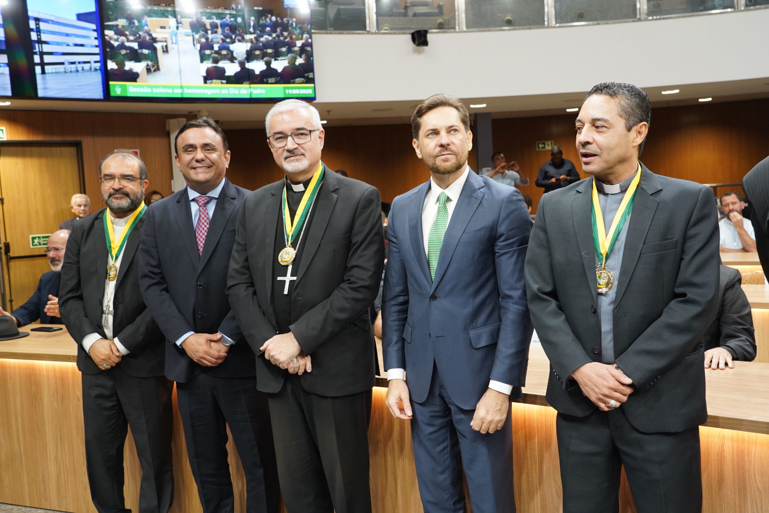 A Assembleia Legislativa de Goiás (Alego) promoveu nessa segunda-feira, 11, a primeira sessão solene em homenagem ao Dia do Padre. A cerimônia, celebrada por iniciativa do presidente da Casa, deputado Bruno Peixoto (UB), foi um reconhecimento à contribuição dos líderes religiosos católicos para a sociedade goiana. Durante o evento, bispos das dioceses de Goiás foram agraciados com a Medalha do Mérito Legislativo Pedro Ludovico Teixeira, a maior honraria concedida pelo Poder Legislativo goiano. Além disso, padres de todas as regiões de Goiás receberam o Certificado do Mérito Legislativo, em reconhecimento aos seus trabalhos pastoral, social e espiritual realizados nas comunidades.Fizeram parte da mesa diretora dos trabalhos, além de Peixoto: arcebispo metropolitano de Goiânia e primeiro vice-presidente da Conferência Nacional dos Bispos do Brasil (CNBB), dom João Justino de Medeiros Silva; deputado federal Zacarias Calil (UB); deputados estaduais Cristóvão Tormin (PRD) e Rosângela Rezende (Agir); bispo diocesano de Jataí, dom Joaquim Carlos Carvalho; bispo diocesano de Ipameri, dom José Francisco Rodrigues do Rêgo; bispo diocesano de São Luís de Montes Belos, dom Lindomar Rocha Mota; bispo auxiliar de Goiânia, dom José Roberto dos Reis; bispo auxiliar de Goiânia, dom Levi Bonatto; administrador diocesano da diocese de Rubiataba-Mozarlândia, padre Diomar Aparecido de Bastos Xavier; pároco da paróquia São Francisco de Assis de Catalão, diocese de Ipameri e presidente da Comissão Regional dos Presbíteros do Regional Centro-Oeste da CNBB, padre Joel Gomes Martins de Souza; presidente da Companhia de Desenvolvimento Econômico de Goiás (Codego), Francisco Júnior; e prefeito de Rubiataba, padre Weber (PSD).