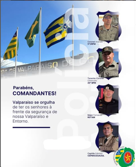 Alegria enorme com as promoções concedidas pelo nosso governador Ronaldo Caiado e vice-governador Daniel Vilela. ao Comandante do 5° Comando Regional da Polícia Militar (5° CRPM-PMGO), Coronel Alessandro Arantes, e o Comandante do 20° Batalhão da Polícia Militar (20° BPM-PMGO), Tenente-Coronel Eric Chiericato, comandante da  Rotam do Entorno, Luis Fernando e o Coordenador do CEPM Céu Azul, Edinisio Nascimento que agora respondem por Coronel Arantes, Tenente-Coronel Chiericato, Capitão Edinisio Nascimento e Major Luis Fernando.  Essas conquistas são mais do que merecidas, fruto do trabalho sério e do compromisso com a segurança pública. A população de Valparaíso segue protegida com o excelente serviço prestado por esses profissionais”, destacou o prefeito Marcus Vinicius.