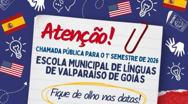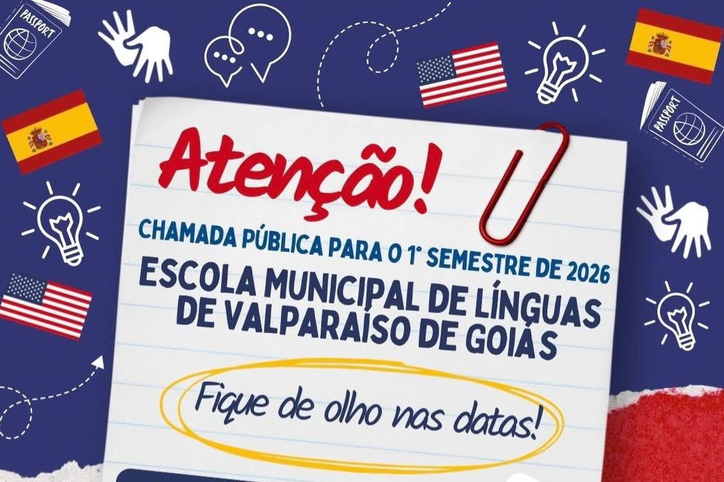 A Prefeitura de Valparaíso de Goiás, por meio da Secretaria Municipal de Educação, publicou o Edital nº 008/2025, que abre a Chamada Pública da Escola Municipal de Línguas (EMLV) para o 1º semestre de 2026. A iniciativa oferece cursos gratuitos e presenciais de Inglês, Espanhol e Libras, destinados a moradores do município, estudantes da rede pública municipal e à comunidade em geral, conforme critérios estabelecidos em edital.