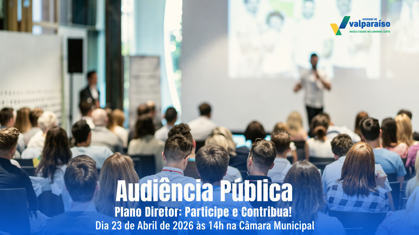 A Prefeitura de Valparaíso de Goiás realizará, no próximo dia 23 de abril de 2026, às 14h, na Câmara Municipal, uma audiência pública para apresentação e discussão das diretrizes do Plano Diretor do município.