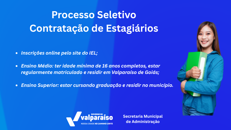 A Prefeitura de Valparaíso de Goiás, por meio da Secretaria Municipal de Administração, anuncia a abertura de processo seletivo para contratação de estagiários de níveis médio e superior. A iniciativa visa oferecer oportunidades de aprendizado e experiência prática aos estudantes do município.