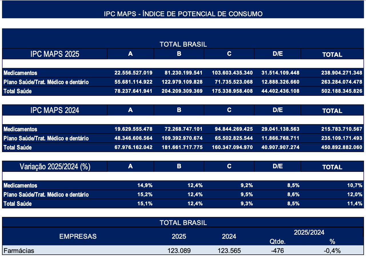 Segundo dados do IPC Maps, especializado em potencial de consumo brasileiro, o setor de saúde deve movimentar no País cerca de R$ 502,2 bilhões ao longo de 2025, o que representa um acréscimo de 11,4% em comparação ao ano passado.