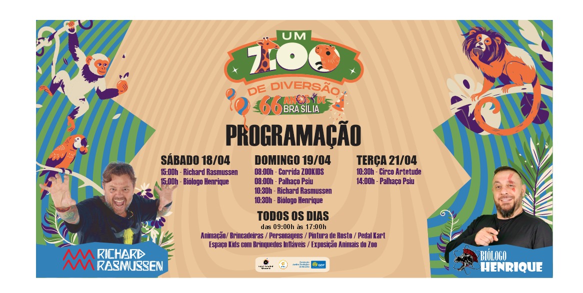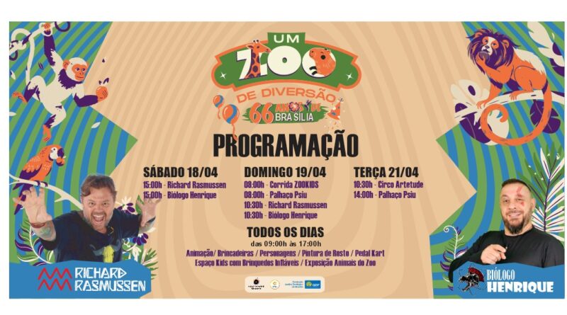 O Zoológico de Brasília recebe mais uma edição de “Um Zoo de Diversão”, que acontece nos dias 18, 19 e 21 de abril, das 9h às 17h, dentro da programação especial de comemoração dos 66 anos da capital federal