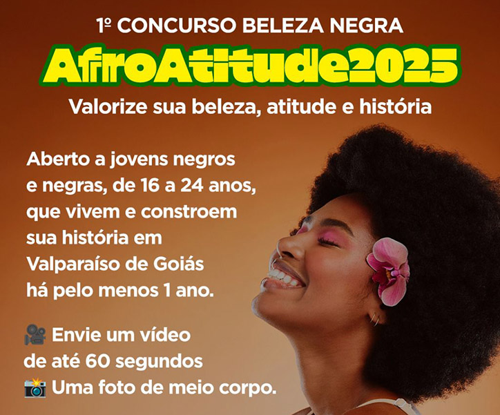 A Prefeitura de Valparaíso de Goiás, por meio da Secretaria da Mulher e da Secretaria Municipal de Cultura e Esporte, abre as inscrições para o 1º Concurso Beleza Negra AfroAtitude 2025, uma iniciativa inédita que tem como objetivo valorizar e promover a representatividade negra, enaltecendo a beleza, a atitude, a história e a identidade de jovens negros e negras do município.