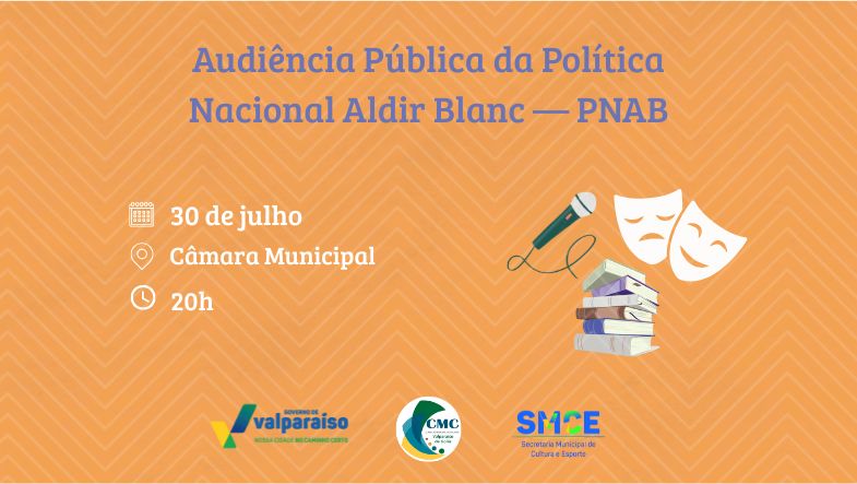A Prefeitura de Valparaíso de Goiás, por meio da Secretaria Municipal de Cultura e Esporte (SMCE) e do Conselho Municipal de Cultura, convida toda a comunidade para participar da audiência pública da Política Nacional Aldir Blanc (PNAB), que será realizada no dia 30 de julho de 2025, às 20h, na Câmara Municipal de Valparaíso de Goiás.