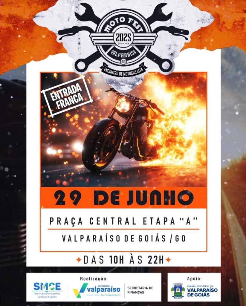 Promovido pela Prefeitura de Valparaíso de Goiás, por meio da Secretaria Municipal de Cultura e Esporte (SMCE) e da Secretaria de Finanças, com o apoio da Câmara Municipal, o Moto Fest chega à sua 21ª edição consolidado como um dos maiores eventos da região para os apaixonados por duas rodas, cultura e rock and roll.